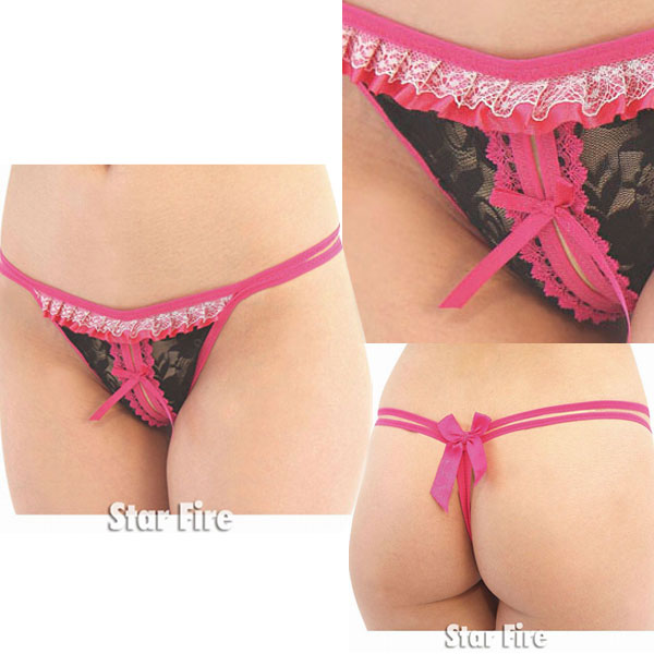 <EROX>クロッチ部分にスリットを入れた、ローズ×黒のセクシーオープンショーツ。 前面は黒い花柄レースにローズ色のフリル飾りをあしらい、差し色として白レースのフリルをプラス!優しい雰囲気の下着に整えました。 後姿は2本のストリングスでかっこよく!フロントとバックにリボンをつけて、可愛くセクシーなGストリングに仕上げました。