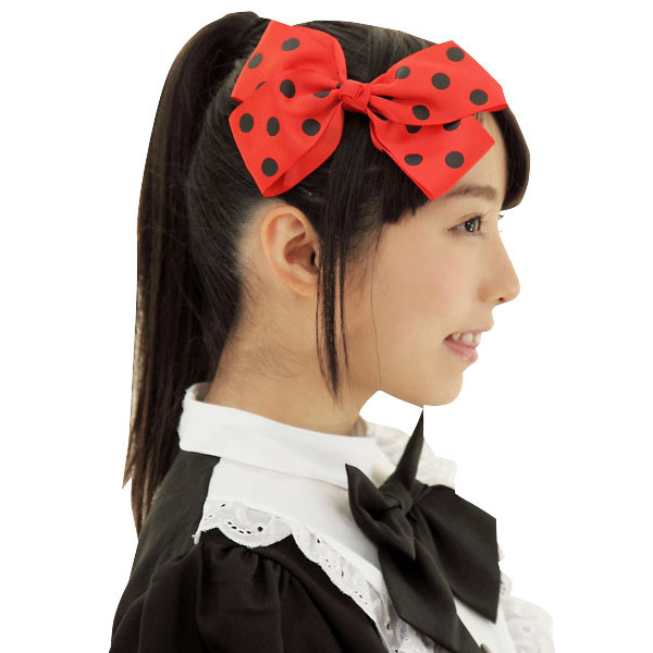 大きなリボンがインパクト大!コスプレはもちろん、普段のファッションアイテムとしても使えちゃうヘアクリップ。 ●キュートな赤×黒のドット柄●装着簡単なクリップタイプ。 コスプレの中でもメイド服との相性抜群!可憐さをプラスしたい時に持っていると便利なアイテムです。