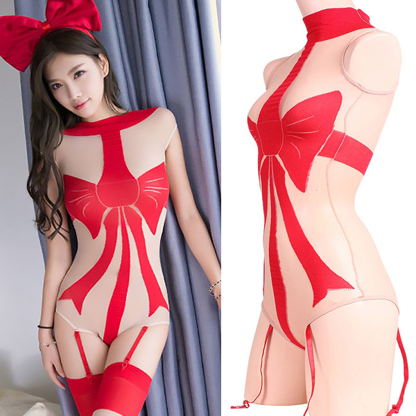 HOME > 下着 > ボディストッキング > はっと目を引くリボン柄ガーターベルト付きボディストッキング&ガーターストッキングセット