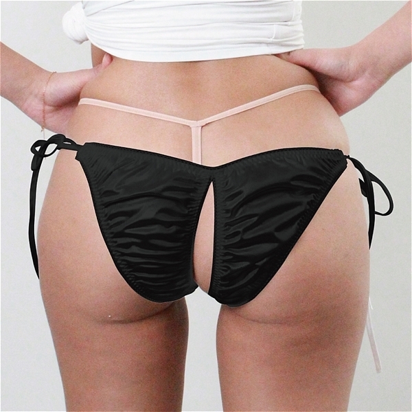 HOME > 下着 > オープン ブラ・ショーツ(穴あき) > 光沢が有り肌触りの良い生地にレース付き脇ヒモ股ワレFB Lサイズ ブラック