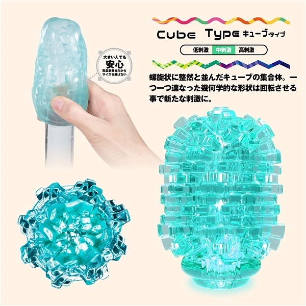 大粒デコボコ刺激がキュット締めつけ!裏返す事で未知なる体験と利便機能を持った変化する密集体ホール。 「Qutto−キュット−」は従来よりも突起が大きく、肉厚になった大粒のデコボコ刺激を搭載。 使用時に本体の凹凸面を内側に返すことで、内側に向かって大粒のデコボコ刺激が密集。 キュット締めつけることで、「未確認の触感」を体験することができます。 キューブタイプは、螺旋状に整然と並んだキューブの集合体。 一つ一つ連なった幾何学的な形状は回転させる事で新たな刺激に。 この商品には個装のローションが付属しています。