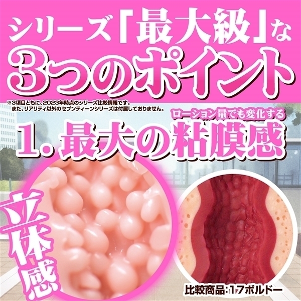トイズハートが誇る看板シリーズ「セブンティーン」、この集大成として大々的に開発をスタートしたのがセブンティーン リアリティです。 改めて二次元と三次元におけるリアルさを追求し、新たなホンモノ体験を具現化することに成功しました。 具体的に一番の試行錯誤ポイントは、素材の硬さです。 最終的にこの硬度に落ち着いた理由としては、イボ=粘膜感としてのリアルが再現できた為です。 絶妙なバランスでイボではなく、まるで粘膜のように感触を感じられ、最終的には満場一致でこの硬度に決定しました。 ローション注入量によっても粘膜感が格段に変化することも特徴のひとつです。 自分だけの丁度良いローション量を探りながらホンモノ体験を楽しんでいただければ幸いです。