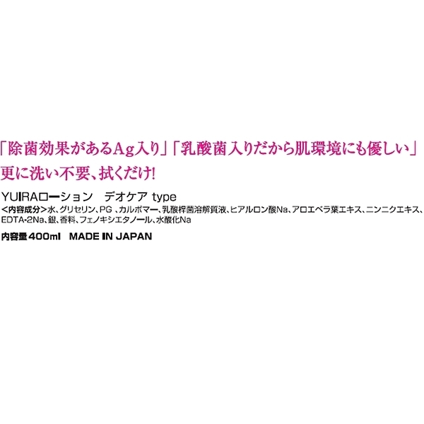 YUIRAより、デオケア成分配合の洗い不要ローションが新発売。 ・除菌効果があるAg入り・乳酸菌入りだから肌環境にも優しい・洗い不要、拭くだけ簡単処理!ムスクの香りも付いて使用後の気になる匂いも軽減!400mlの丁度いいボリューム感!普段使い様のスタンダードモデルです! ※安心安全の日本産商品です。 <内容成分>水、グリセリン、PG、カルボマー、乳酸桿菌溶解質液、ヒアルロン酸Na、アロエベラ葉エキス、ニンニクエキス、EDTA−2Na、銀、香料、フェノキシエタノール、水酸化Na<使用上のご注意>・非常に滑りやすいのでご使用の際は十分に注意してください。 ・誤って飲み込んだ場合、お肌に合わない時はすぐに使用を中止し専門医に相談してください。 ・お子様の手の届かないところで保管してください。 ・直射日光のあたる場所、高温・多湿の環境での保管は避けてください。 ・目に入った場合は綺麗な水、又はお湯で洗い流してください。 ・開封後はなるべくお早めにご使用ください。