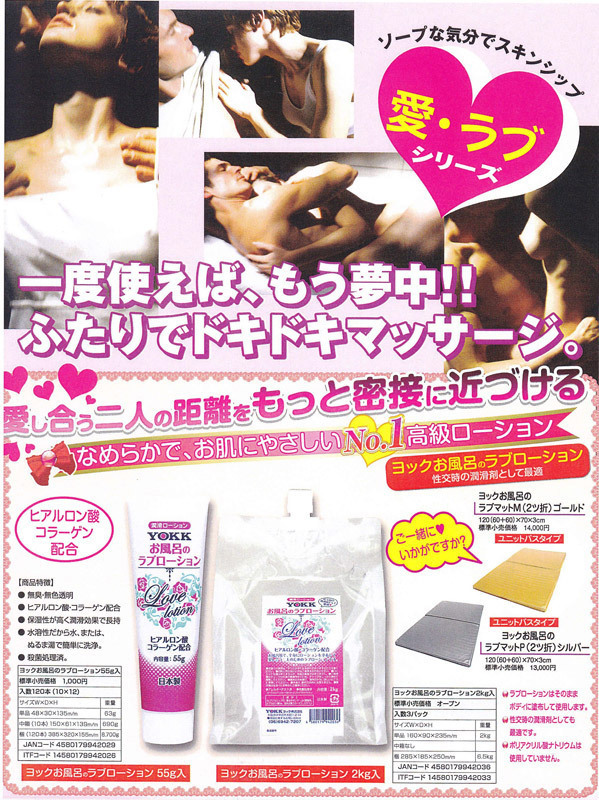 業務用マットでもお馴染みのヨック製!お風呂場で濃厚なヌルヌルプレイが楽しめる大容量ラブローション。 ●詰め替えに便利なキャップ付きパウチ入り●お肌潤うヒアルロン酸&コラーゲン配合●風俗店でも扱いやすい無臭・無色透明●高い保湿性で長時間潤いが長続き●水やぬるま湯で簡単に洗浄出来る水溶性●安心してお使い頂ける殺菌処理済み●アレルギーテスト済(全ての方にアレルギーが起きないという訳ではございません)。 滑らかな使用感の潤滑ローション!全身にたっぷり塗布して二人の愛をもっと高めましょう。 【成分】 ※水、グリセリン、PG、親水性ポリマー、pH調整剤、ヒアルロン酸Na、加水分解コラーゲン、パラベン。