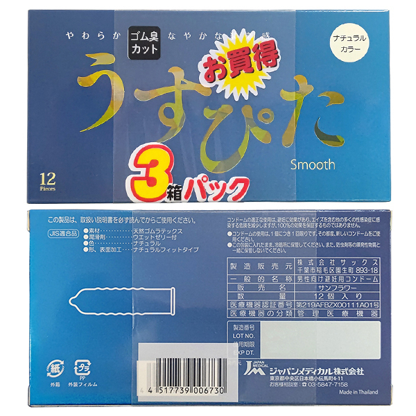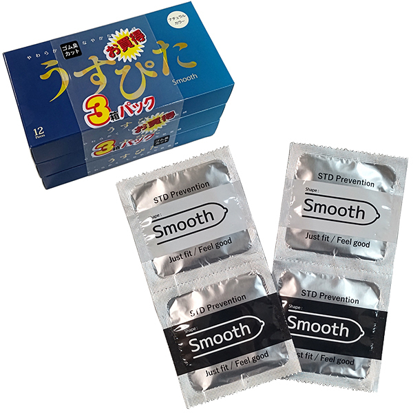 HOME > コンドーム・避妊具 > 薄い・厚い(早漏防止) > うすぴた スムース 12個入り×3箱パック
